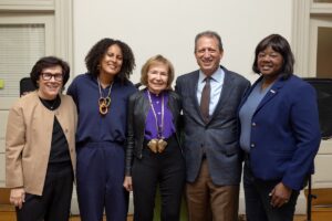Prospect Park Alliance Board Chair Iris Weinshall, Prospect Park Alliance President, Morgan Monaco, Shelby White, Founding Trustee of the Leon Levy Foundation, New York City Comptroller Brad Lander and Deputy Brooklyn Borough President Kim Council announce the Shelby White and Leon Levy Woodlands Endowment.